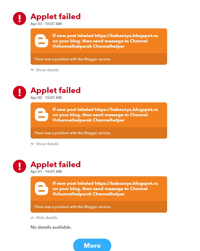 Раздел Activity показывает ошибки за апрель, при этом посты были опубликованы 31 марта. Кнопка MORE не работает. Ссылок в телеграме о парсинге я не вижу.